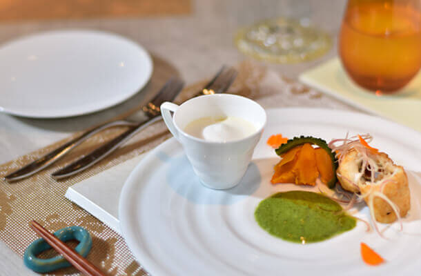 スタジオーネは九州の豊かな食材の『旬』を何よりも大切にしています。『旬』のものはとても新鮮で、栄養価も高く、美味しさは格別です。そんな『旬』をお届けする為に、食材は毎朝自らの足で生産者さんのもとへ赴き、その時に最も良い状態のものを厳選します。農家の方々がこだわりをもって作られた野菜や市場直送の魚介、大切に育てられた九州各地のお肉等は、素材本来の味を存分に引き出す事ができます。